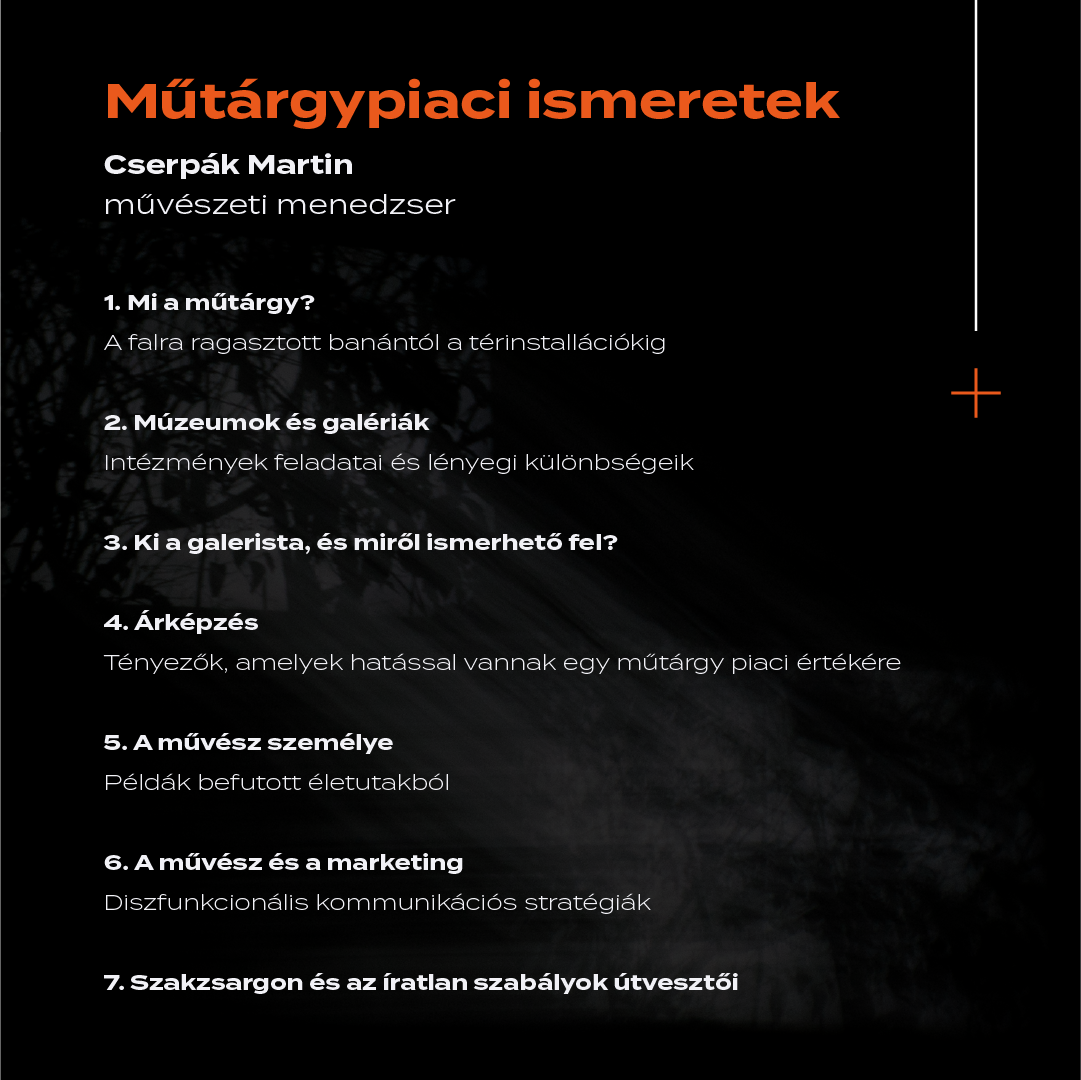 2025. március 24. Cserpák Martin: Pályakezdő művészek segítése, műtárgypiaci előadás: hazai műtárgypiac berendezkedése, műtárgy árazás (mik azok a szorzók, ami alapján meghatározhatjuk egy munka piaci értékét), megjelenési lehetőségek (fórumok, art fair, független kiállítóhelyek) - Kutatásmódszertani szeminárium